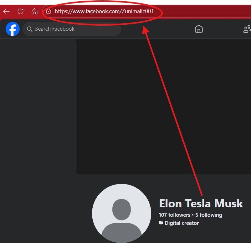 Here we have a fake Elon Musk profile that has Elon Musk displayed but the profile URL has a different name.
