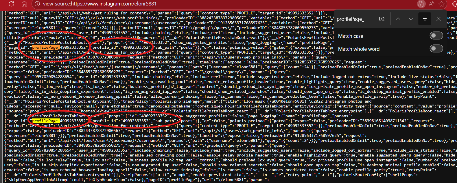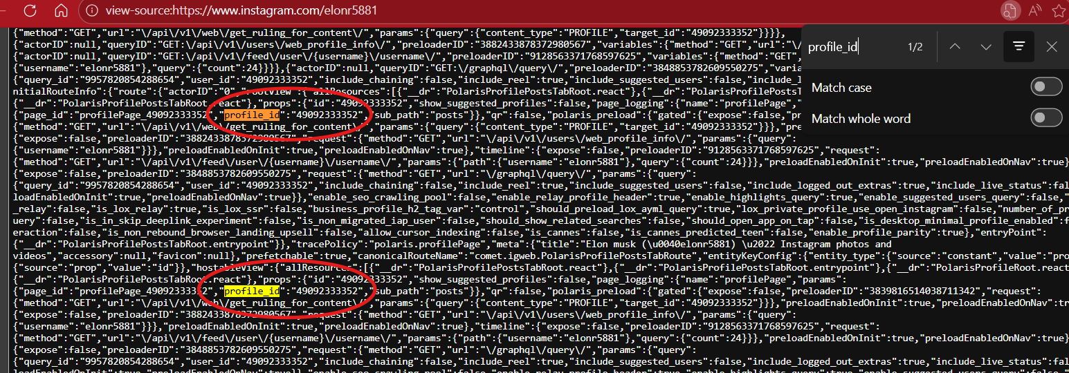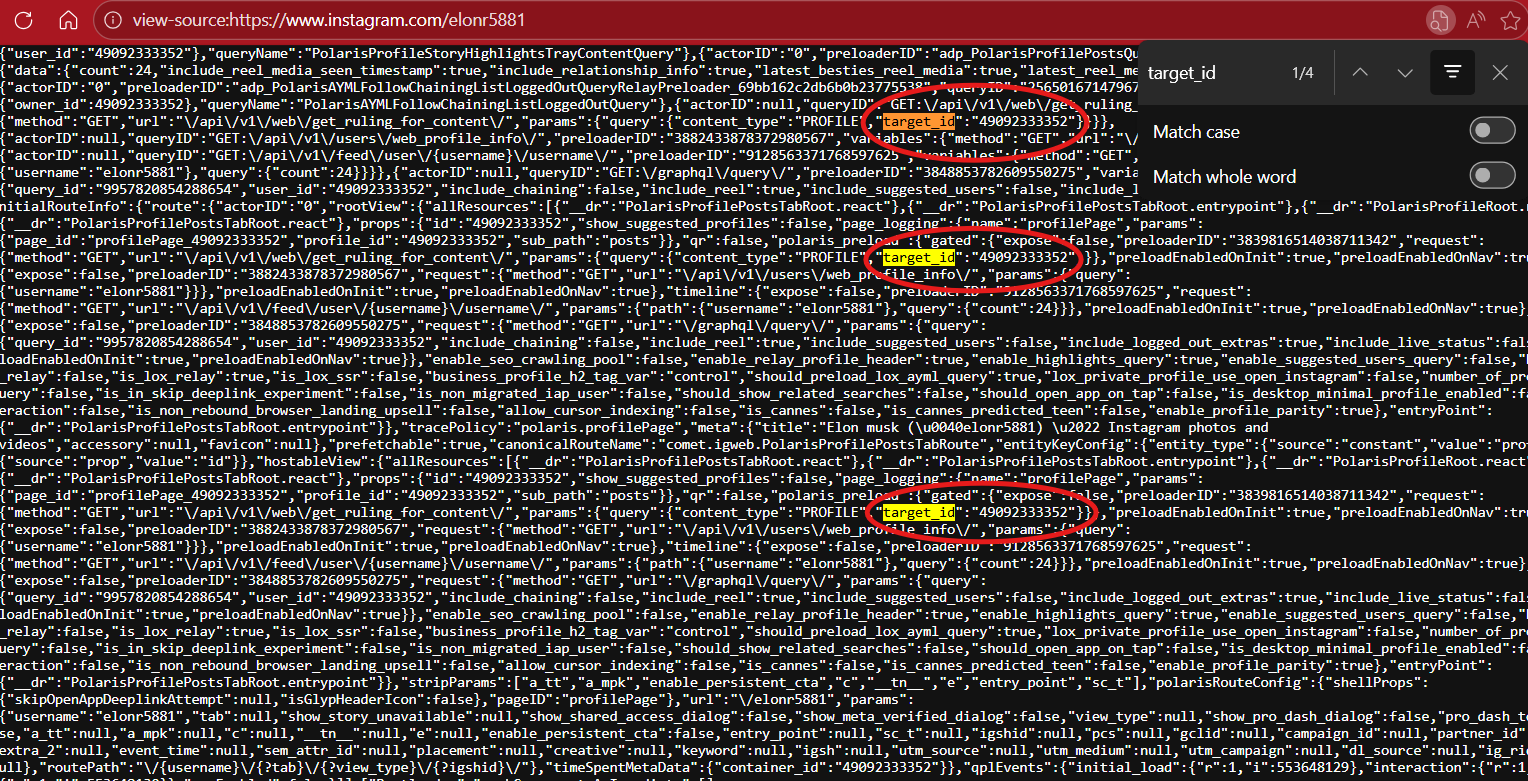 3. Hold “ctl” + “F” which is your find option. A box will open up. This is where you will type in the following key words to find the Instagram User I.D. number: